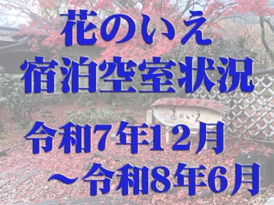 スタッフからのお知らせ 花のいえの歴史ブログ 支配人便り お知らせ イベント情報 花のいえ周辺情報 宿泊・プラン情報 空室状況 宿泊プラン おすすめプラン 季節限定プラン リーズナブルプラン 未分類 2025.11.01 空室状況 令和7年11月~令和8年5月空室状況(11月1日更新) 2021.03.01 空室状況 令和3年3月~令和3年9月空室状況(3月1日更新)